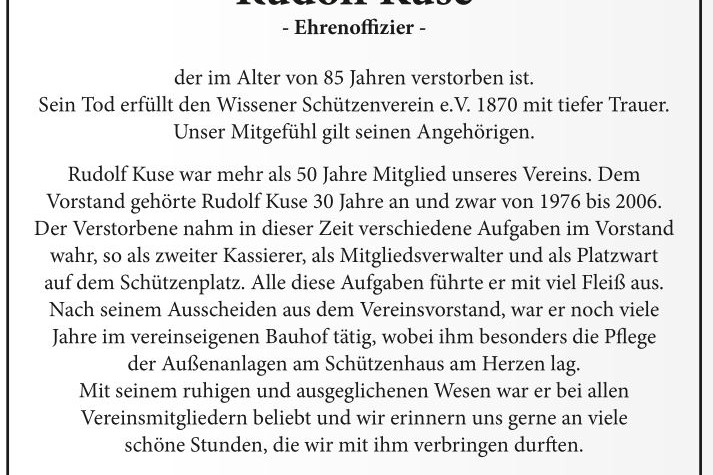 Unser Ehrenoffizier Rudolf (Rolf) Kuse ist im Alter von 85 Jahren verstorben. Rolf war über 50 Jahre Mitglied im Wissener Schützenverein und hat in…